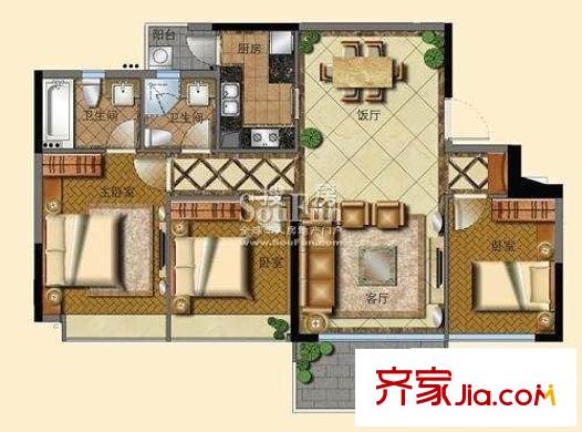佳大银湾户型图A3栋04单位 3室2厅2卫1厨