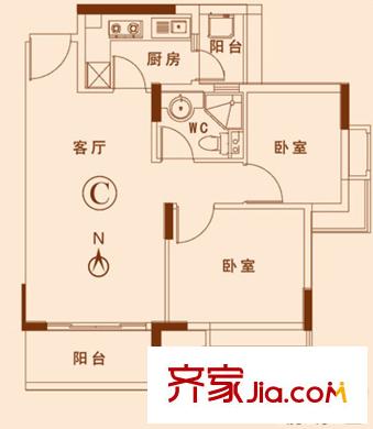 卡布奇诺C户型两房一厅 2室2厅1卫1厨