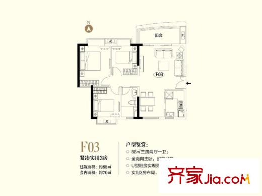 翠屏・瀚宇贵都二期F03户型图 3室2厅1卫1厨