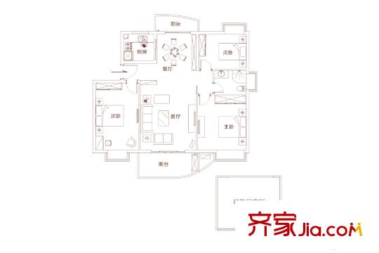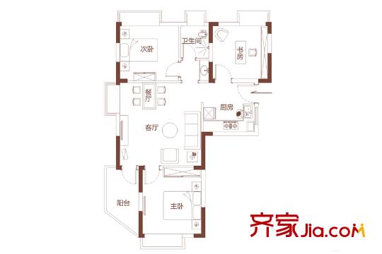 龙居沃城洋房B户型 3室2厅1卫1厨