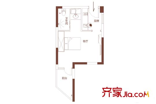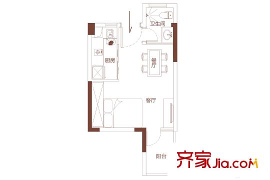 龙居沃城高层小套房D户型 1室1厅1卫1厨