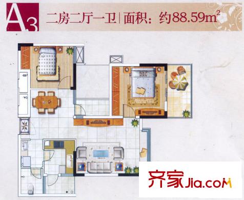玺园户型图A1户型单数层 2房2厅1卫 88.05平方米 2室2厅1卫1厨