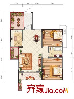 伟梦清水湾东方院B2户型 2室2厅1卫1厨