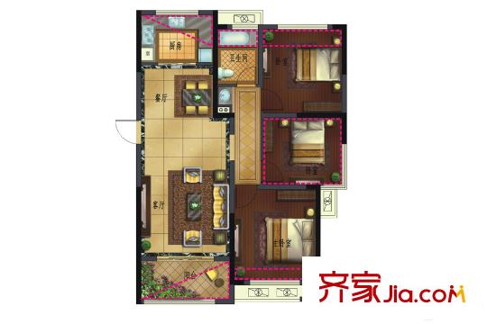 煌盛中央公园高层A户型 3室2厅2卫1厨
