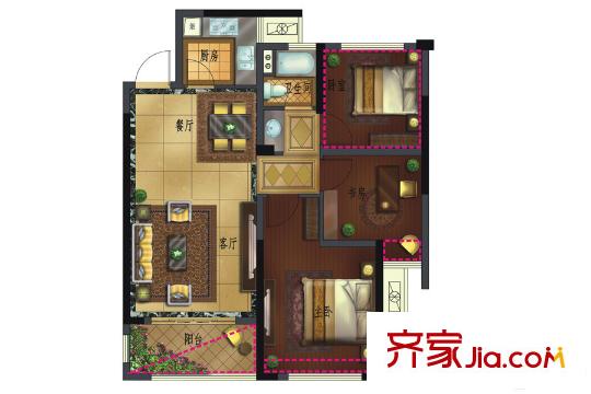 煌盛中央公园高层D户型 3室2厅1卫1厨