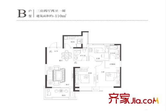 新力雅园中间户B户型图 3室2厅2卫1厨