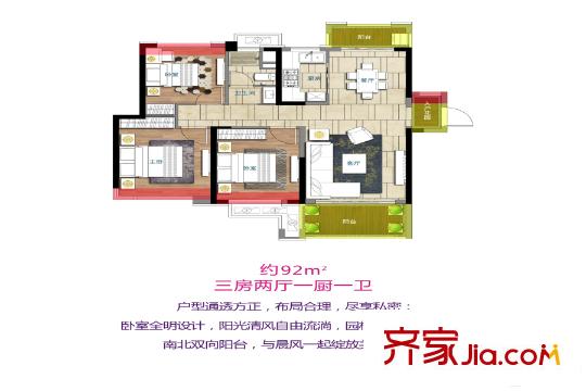 新力愉景湾一期3#、5#高层电梯房B3户型 3室2厅1卫1厨
