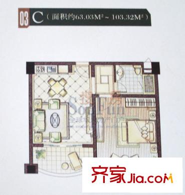 恒茂森林海户型图C户型 1室2厅1卫1厨