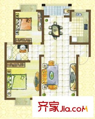 银河城A1户型 2房2厅1卫1厨 86.8平方米 2室2厅1卫1厨