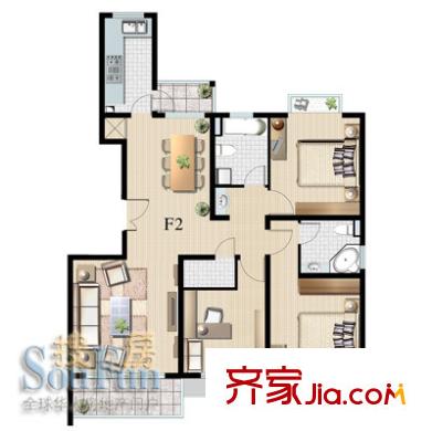嘉杰国际广场户型图F2户型 3室2厅2卫1厨