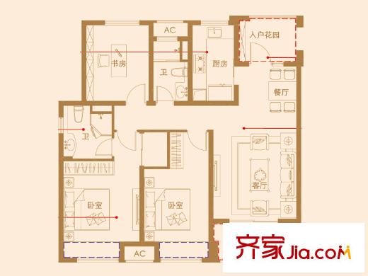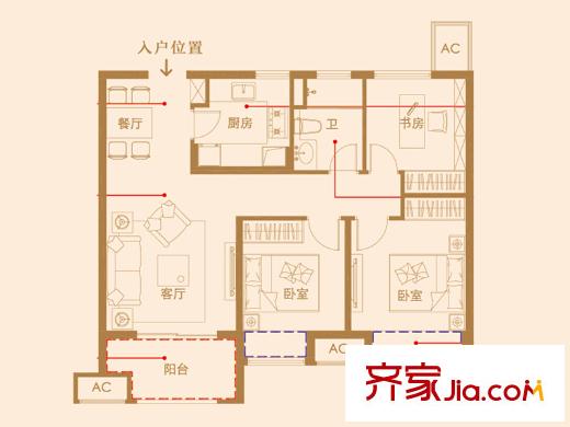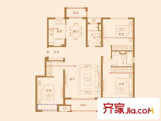 中海・凤凰熙岸E1户型 3室2厅2卫1厨