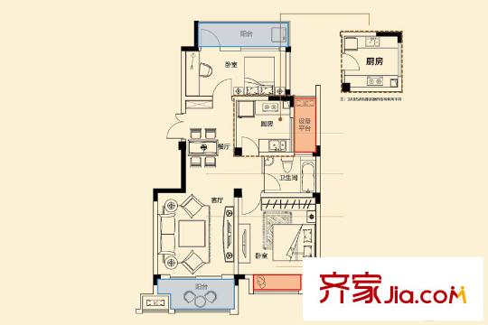 金轮星光名座生活广场77平户型 2室2厅1卫1厨